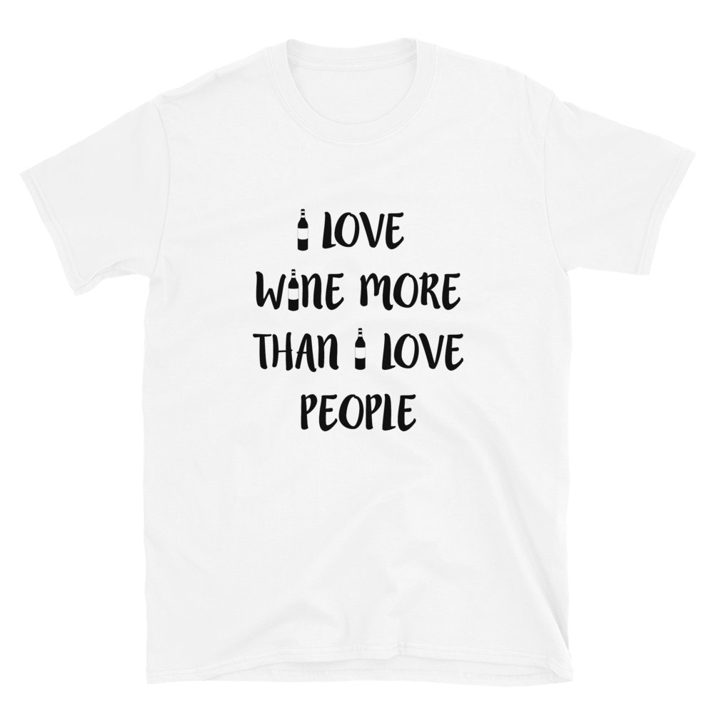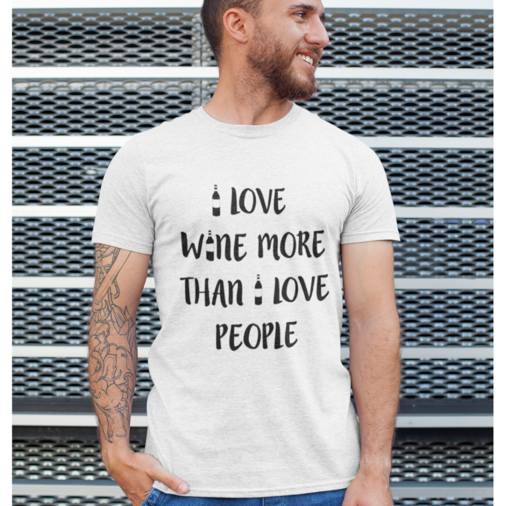 Wein hört zu, Wein stellt keine Fragen, Wein ist unkompliziert,... Die Argumente können endlos fortgeführt werden. Es gibt tausende Gründe, Wein mehr zu lieben als alles andere. Dieses Shirt zeigt dein klares Statement: I LOVE WINE MORE THAN I LOVE PEOPLE! Das verspielte aber minimalistisch gehaltene Trenddesign ist ein absoluter Hingucker und ein must have in deinem Kleiderschrank!